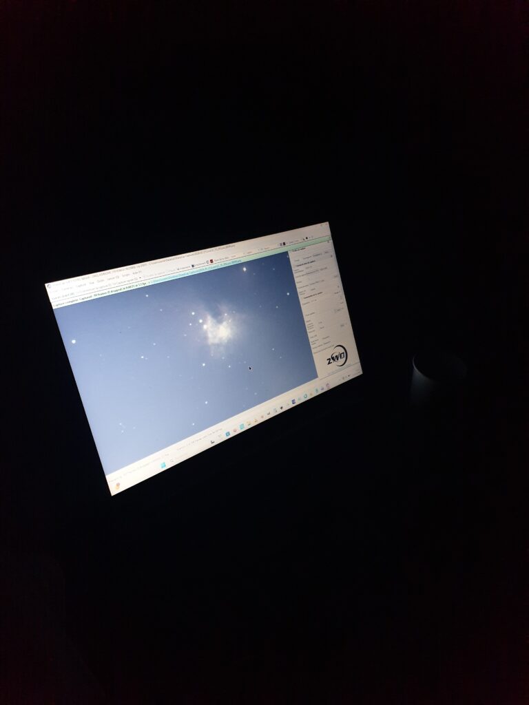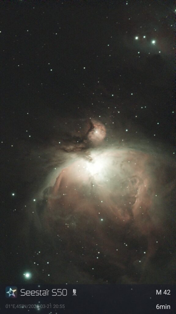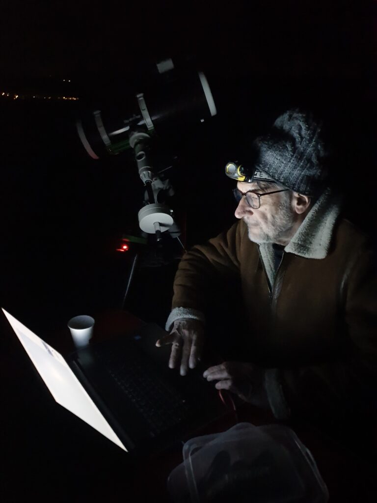 Après installation et paramétrage, il a pointé M42 (la nébuleuse d’Orion) et réalisé plusieurs prises de vue avec poses, affichées en direct sur ordinateur. Encouragé par ce premier succès, il a tenté une observation des Pléiades, en procédant à divers ajustements techniques pour améliorer la focalisation. Les résultats définitifs seront évalués après traitement des images.